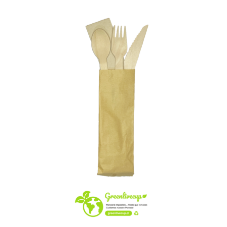 SET DE CUBIERTOS DE MADERA CON SERVILLETA Set de cubiertos: Tenedor, cuchillo y cuchara junto con su servilleta, empaque individual sellado de papel kraft. Ideal para llevar. Puede ser utilizado tanto en restaurantes, deliverys, como en locales de comida rápida CANTIDAD POR EMBALAJE: 1000 UN. X CAJA Para ventas: ventas@greenlivecup.cl…